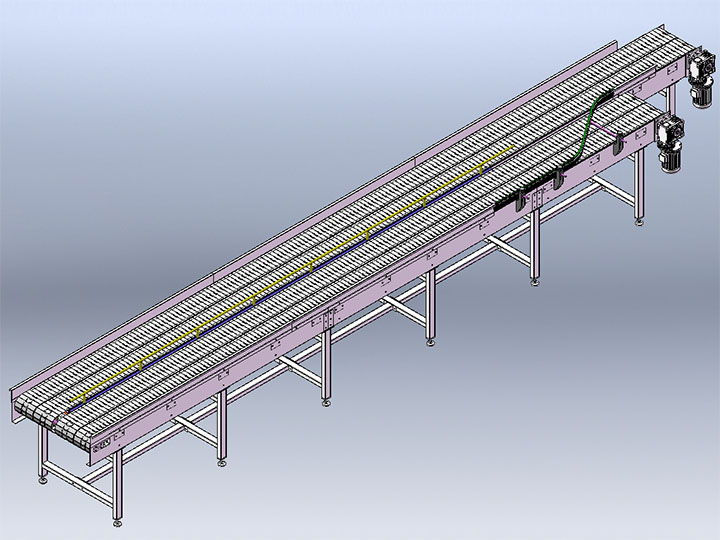 鏈板輸送機是一種以標準鏈板為承載面,由馬達減速機為動力傳動的傳送裝置。鏈板式輸送機,由動力裝置(電機)、傳動軸、滾筒、張緊裝置、鏈輪、鏈條、軸承、潤滑劑、鏈板等等構(gòu)成。其中帶動物料的輸送的主要的兩個部分為:鏈條,利用它的循環(huán)往復(fù)運動提供牽引動力;金屬板,作為輸送過程中的承載體??梢酝ㄟ^多列鏈板并行,使鏈板輸送機做的很寬并形成差速,利用多列鏈板的速度差使多列輸送在無擠壓的情況下變?yōu)閱瘟休斔?,從而滿足飲料貼標、灌裝、清洗等設(shè)備的單列輸送的要求,我們可以將兩條鏈板輸送機的頭尾部做成重疊式的混合鏈使得瓶(罐)體處于動態(tài)過度狀態(tài),使輸送線上不滯留物料,可以滿足空瓶以及實瓶壓力和無壓力輸送。